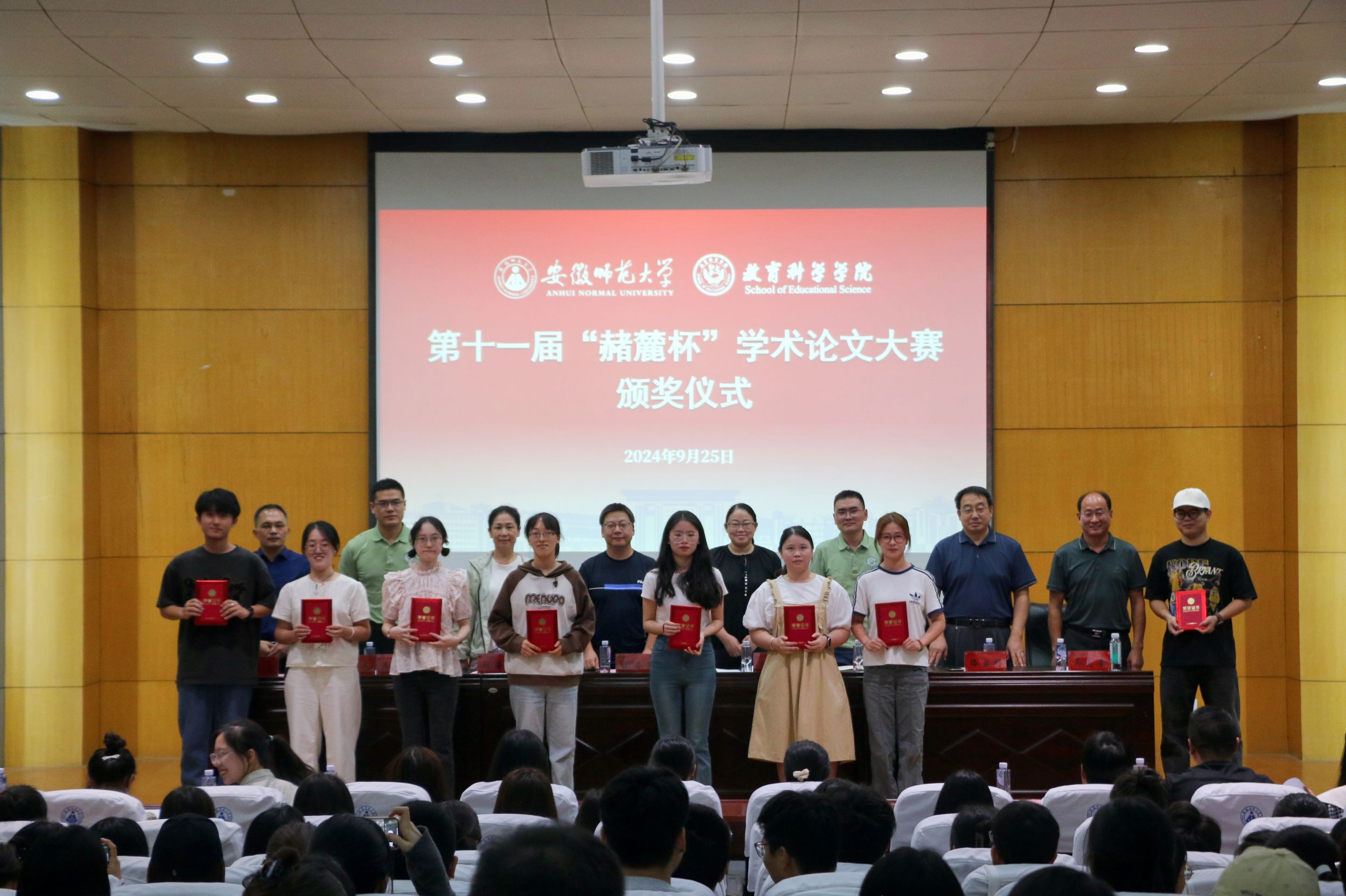 本届“赭麓杯”获奖同学代表上台领奖。院领导班子成员及各学位点负责人作为颁奖嘉宾颁奖。“赭麓杯”旨在促进学院同学积极参与学术实践活动,积极提升自身学术能力以及科研协作能力,是教科院积极推动学校“大行动计划”的一项重要举措。