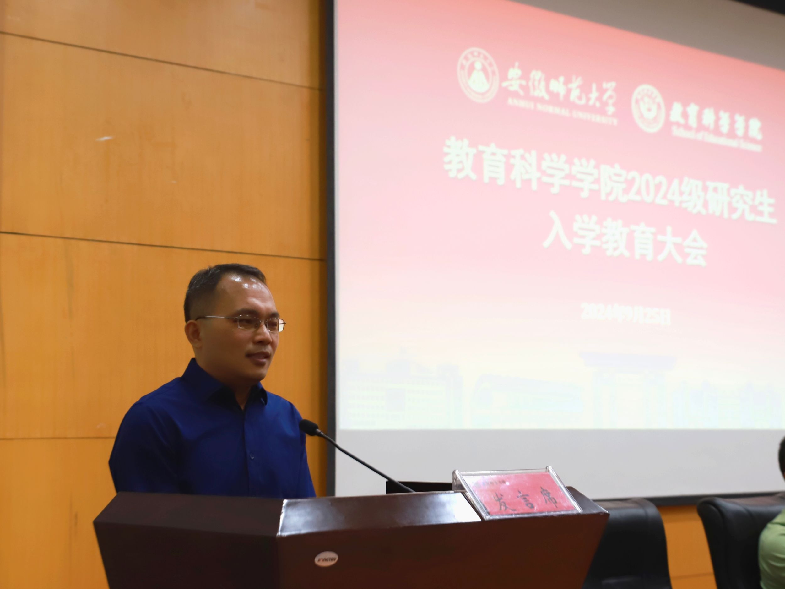 许国飞代表学院致辞。许国飞从“专业、学科、课程、师资、平台以及优秀校友”等六个方面全面论述了教科院悠久的办学历史以及雄厚的教学实力。此外,许国飞从端正政治思想、不断勤奋学习、丰富实践经历、坚定学术底线以及不断自我革命等五个方面向全体新生提出了殷切期望,勉励大家未来三年在学院可以获得成长,谱写美好青春。