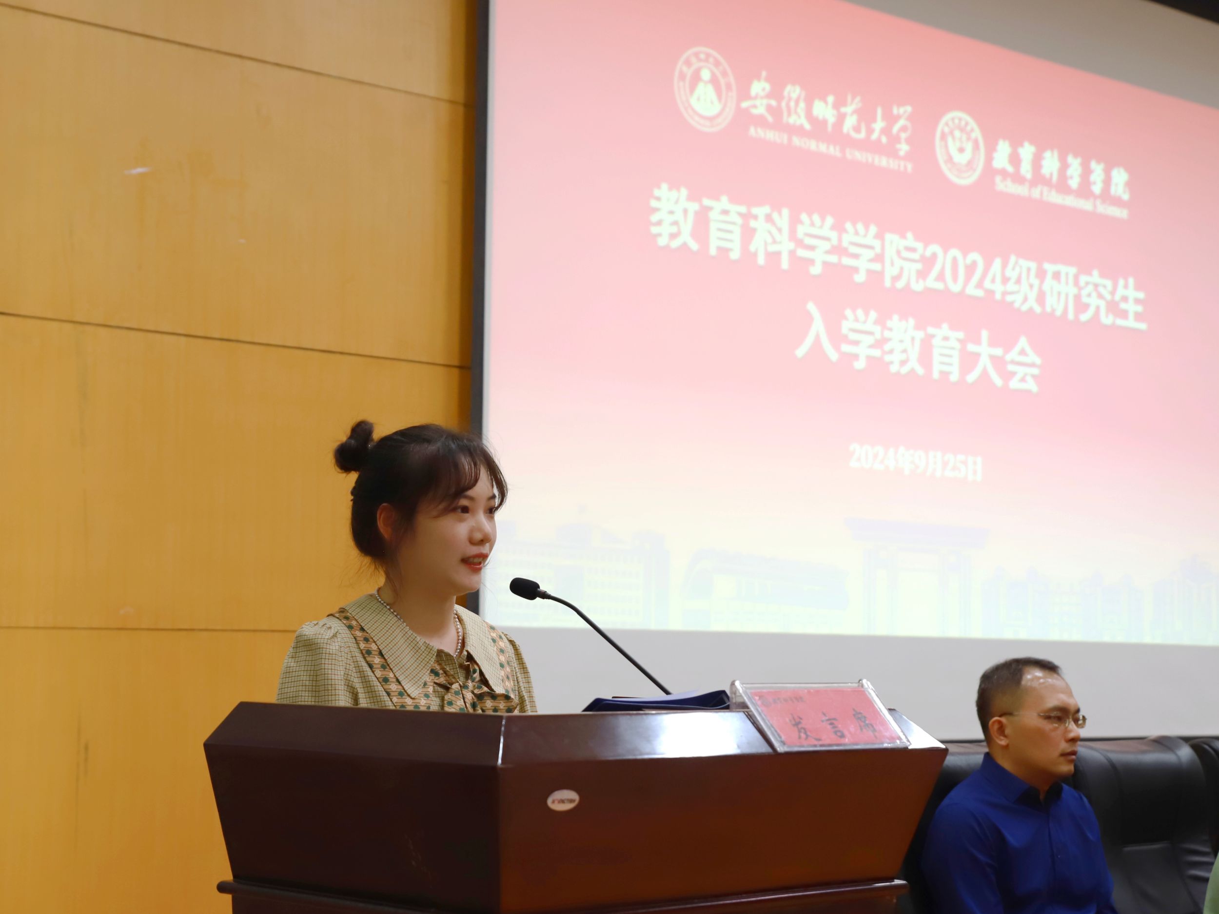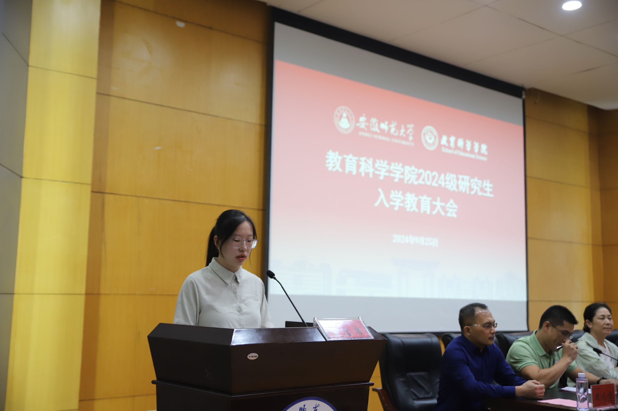 会初,全体师生齐唱国歌。2024级学前教育学专业薛敏作为新生代表发言。薛敏从自身的支教经历出发,将站在讲台上的实践经验与坐在教室里的汲取知识相结合,充分展示了教育的强大力量。2022级小学教育学专业俞晓雨作为老生代表发言。俞晓雨认为,研究生应扎根专业的沃土,通过不间断地学习、实践,培养自身“精益求精”的恒心、“不惧风雨”的耐心以及“向上生长”的信心,以全新的姿态面对即将到来的研究生生活。2021级心理学专业赵欣桐作为毕业生代表发言。赵欣桐总结硕士阶段的经验,提醒新生应珍惜时光、积极规划、勇于探索、不断学习,以实现个人梦想和目标。