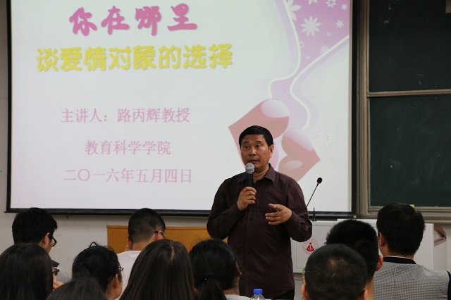 本网讯(教科院 莫大贡)为更好的引导青年大学生理性面对爱情,走好人生之路,5月4日晚,在五四青年节到来之际,我院邀请全国师德标兵、安徽省十大教育人物、“丙辉漫谈”主讲人路丙辉教授与青年学生共话爱情。2015级教育学、心理学、应用心理学等5个专业的同学参加了本次漫谈,漫谈由2015级辅导员莫大贡主持。