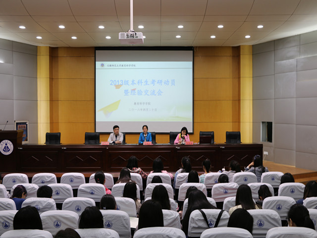 本网讯(教科院 祝晓文)2016届的考研复试录取工作已经落下了帷幕,为帮助2013级本科生做好职业规划,4月20日下午,教育科学学院于田楼报告厅面向2013级的全体学生举办了2017届本科生考研动员大会暨考研经验交流会。教科院党委副书记张如华、副院长李宜江、 2012级辅导员孟庆娟、2013级辅导员马兴以及2013级的全体学生都到场参与了此次交流活动。此次活动由张如华主持。