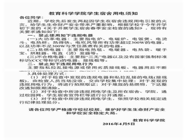 此次活动重点检查违规电器的使用情况。学院提前拟定《教育科学学院学生宿舍用电须知》,在检查过程中进行张贴,从规章制度中更加严格地规定学院学子在宿舍中的用电情况,切实可行地做好学生宿舍的安全工作。