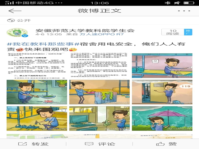 本次活动为了更加贴近当今时代学生的生活,学院特地于线上进行了校园安全的相关宣传,微博作为主力军,发挥着不可忽视的作用,在各学生线上组织中广泛宣传,引起学生的广泛关注与支持,学生也在这个过程中加强了对校园安全的了解和重视。