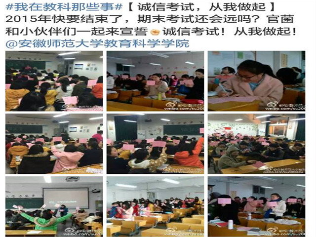 除了诚信展板的绘制和标语的播放,教科院学生会还通过官方微博呼吁教科学子诚信考试,从我做起,为诚信考试宣誓。通过此次活动,使诚信的种子播种人心,相信同学在接下来的学习生涯中,不仅是在考试中遵守考规考纪,在日常生活中也会诚信待人。也预祝同学们能够在期末考试中取得优异的成绩。