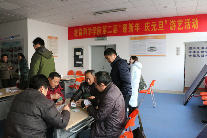 本网讯(教科院 黄引娣)12月31日下午,教科院职工活动室内张灯结彩,喜气洋洋。学院工会组织的第二届“迎新年、庆元旦”游艺活动在这里拉开帷幕。学院领导班子成员亲临游艺活动现场,兴致勃勃地与近百名教职工一起参加活动,共同辞旧迎新。
