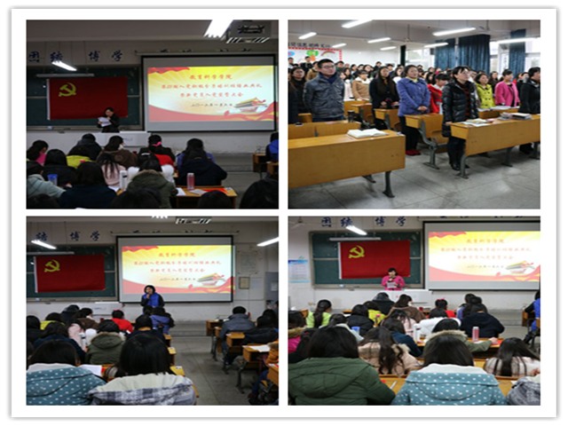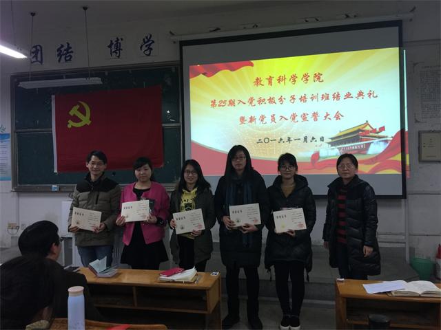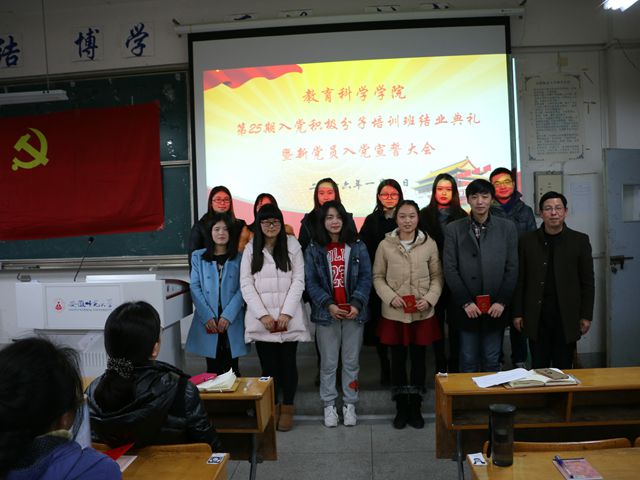 本网讯(教科院 高婷 马兴)伴随着元旦的喜庆,教育科学学院又迎来了一批新党员。1月6日,教育科学学院第25期入党积极分子培训班结业典礼暨预备党员宣誓大会在8101教室举行。该院党委书记刘晓宇、党委副书记张如华、党委秘书柳丽娜、本期培训班全体学员、本学期学院发展的预备党员和转正党员出席了此次大会。大会由本期培训班班主任马兴主持。