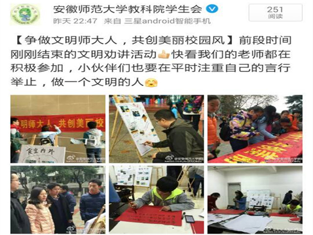 为了更好地发现校园里存在的各种文明和不文明现象,在对比的的过程中帮助广大同学维护校园文明,争做文明达人。院学生会举办了“镜头下的文明行为”主题摄影活动,经过前期的动员宣传,我们共收集整理出109张照片,并于赭山校区食堂门口进行了集中展示。