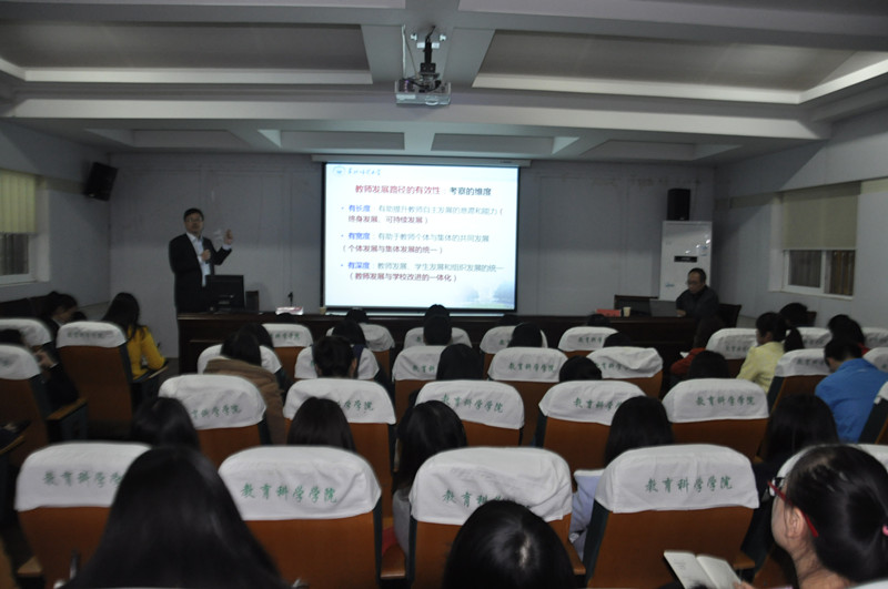 讲座过程中,饶从满教授详细阐释了教师发展问题凸显的背景和教师发展路径的选择。他指出,教师发展路径的选择要具有有效性和可行性,并从自主反思、同事合作、教学相长三个方面来详细阐释教师发展的主要路径,把潜在资源变成现实,需要在教师与自身、与同事、与学生之间建立一种“对话”关系,倡导在与自我的对话中成长、在与同事的对话中发展、在与学生的对话中共进。