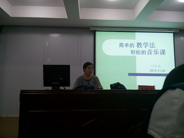 讲座开始,汪红诚老师先是从一般音乐教育与幼儿音乐教育的对此入手,讲述了幼儿园音乐教学的基本内容与教学特点,指出让幼儿展现能力比表现技巧更重要的课程目标。随后汪老师分别从音乐教学的"四大领域"——欣赏活动、歌唱活动、打击乐和集体舞,结合教学案例,为同学们生动地展示了一堂轻松的音乐课是如何'炼'成的。一首《音乐之声》的主题曲在汪老师的经验智慧下被改造成了《做饼干》——每一节音符的跳动都成了做饼干的若干步骤,随着"饼干"的出炉,音乐节奏也深深印在了幼儿的心里;在歌唱部分,汪老师强调了教师在范唱时,必须遵循"先清唱再伴奏"的轻唱原则,这样才能让幼儿耐心、富有兴趣地进行下去,养成一双善于倾听的耳朵;对于音乐教学中公认的重难点——打击乐,汪老师表示,掌握好课堂节奏,把握住孩子的兴趣,打击乐教学依然可以轻松进行!她从音乐的选择到总谱的设计,再从总谱的变通到乐器的加入,均以实际的案例和有趣的示范引得同学们连连赞叹和深深折服,现场掌声不断。此外,汪老师还和学前学子们慷慨分享了自己多年教学的窍门心得,让大家获益匪浅。而每一次的游戏互动,不仅让同学们重温了童年音乐之乐,更让大家亲身感受到简单的教学法带给音乐课堂的轻松活泼,而这一切都离不开执教人细腻的智慧。