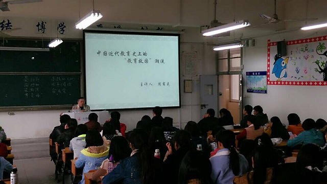 八十多岁的周商克先生精神矍铄,以在黑板上题写为“教育救国”事业作出重大贡献的部分学者的名字为开场,接着向同学们详细介绍了各位先辈的事迹。比如,“不做官、不发财,终身献给劳苦大众”的晏阳初先生;主张“生活即教育、社会即学校、教学做合一”的陶行知先生;在山东邹平进行乡村建设实验的国学大师梁漱溟先生;一生致力于职业教育的黄炎培先生;毁家办学的高践四先生;师大教育系第一任系主任周辛先生;主张民众教育的俞庆棠先生。