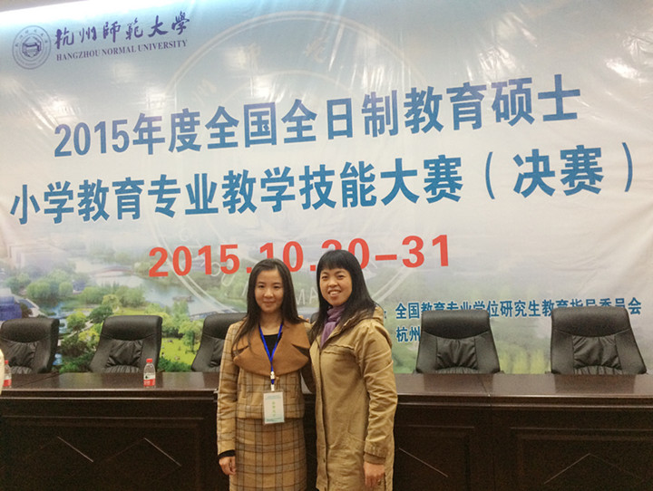 本网讯 教科院 王立硕 为了展示全日制教育硕士的培养成果,促进院校之间相互交流,不断提高专业学位硕士研究生的培养质量,10月30日—31日,2015年度全国全日制教育硕士小学教育专业教学技能大赛(决赛)在杭州师范大学仓前校区国际会议厅拉开帷幕。我院2014级杨玲玲同学由导师王芳副教授带队参加了比赛,最终喜获三等奖。
