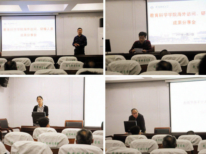 本网讯 教科院 黄引娣 为了解当前国际高等教育发展的趋势与国外课堂教学的先进理念,让全体教师共同分享赴海外研修教师的学习收获,达到共同提高的目的。10月21日下午,我院在院三楼学术交流中心举行了出国访学研修教师的经验分享会,全院教职工参加了会议。会议由学院党委书记刘晓宇主持。