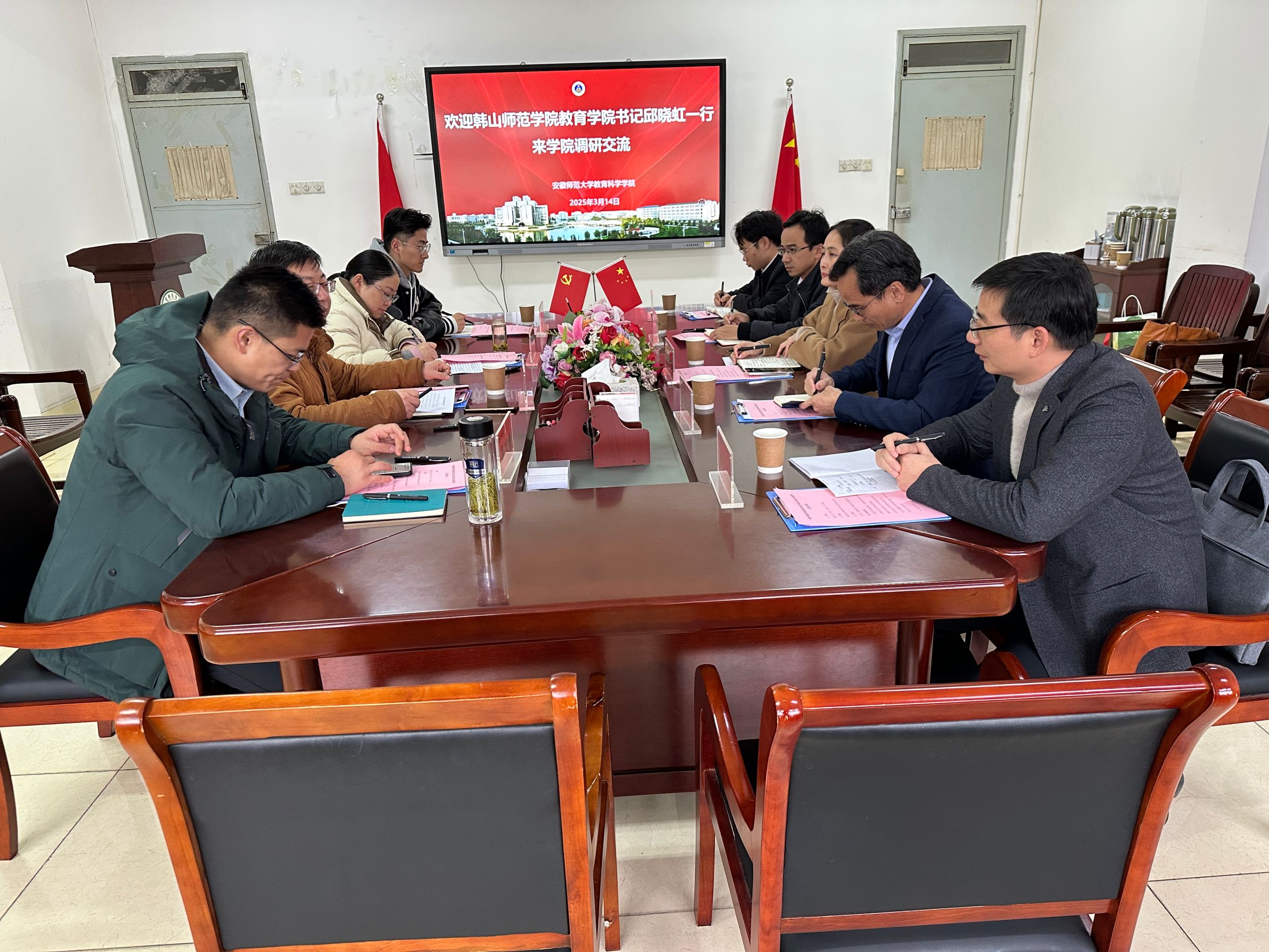 许国飞对韩山师范学院教育科学学院一行的到来表示热烈欢迎,并详细介绍了学院的总体情况以及党建工作开展情况。他强调党建工作在学院发展中的引领作用,分享了在党组织建设、党员教育管理等方面的经验做法。邱晓虹介绍了韩山师范学院的办学历史和教育科学学院的总体情况。薛胜兰介绍了学院的学科和专业结构,师资队伍,特别是人才需求和招聘计划。他详细阐述了韩山师范学院在吸引高层次人才方面的优惠政策、创新举措,以及在人才培养、职业发展等方面为人才提供的良好环境。杜凤分享了学院在学生思想政治教育、学风建设、心理健康教育等方面的实践经验,以及在提升学生综合素质、促进学生全面发展上的有效做法。吴文涛介绍了学院学科建设、研究生教育工作。他从学科发展规划、科研平台建设、研究生培养模式创新等方面进行阐述,展示了学院在学科建设和研究生教育方面的成效。在交流讨论环节,双方参会人员围绕党建工作、人才引进、学生管理、学科建设和研究生教育等话题展开热烈讨论,现场气氛热烈。