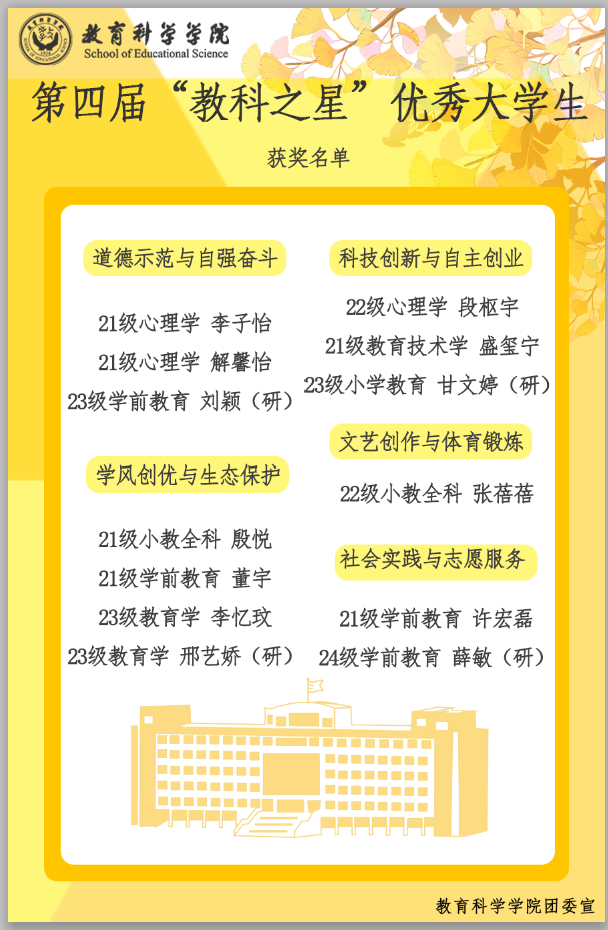 “教科之星”十佳大学生评选挖掘不同领域的优秀典型,选树身边的榜样,激励同学们在专业深耕中锤炼本领,在实践奉献中涵养品格。希望更多教科学子全面发展,争做德才兼备、知行合一的新时代教育先锋。