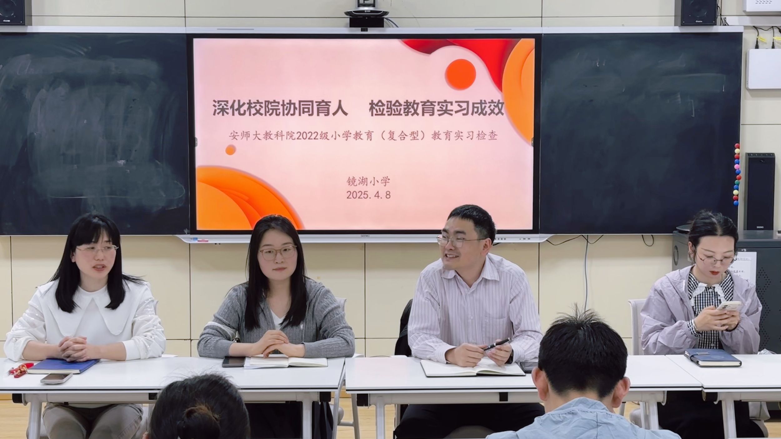 为深化校院协同育人机制,强化教育实习过程管理,4月8日下午,教育科学学院副院长韩建涛一行赴芜湖市镜湖小学开展2022级小学教育(复合型)专业实习中期检查。检查组成员包括专业负责人陈娜、实习指导教师胡微,镜湖小学教导处副主任刘琳主持会议,10名实习生及带教教师代表参会。