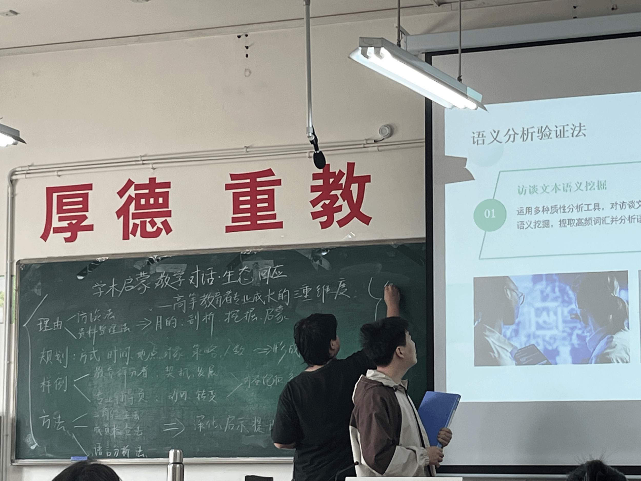 第二组成员作了《转专业学生"次级社会化"现状研究》的学术汇报。该组从学科文化、人际交往和职业预期三个维度,详细阐述了转专业学生的"次级社会化过程"。针对现场同学提出的抽样策略和研究对象界定问题,小组成员进行了回应。徐红教授随后深入解析了抽样方法,并重申了质性研究的规范原则。