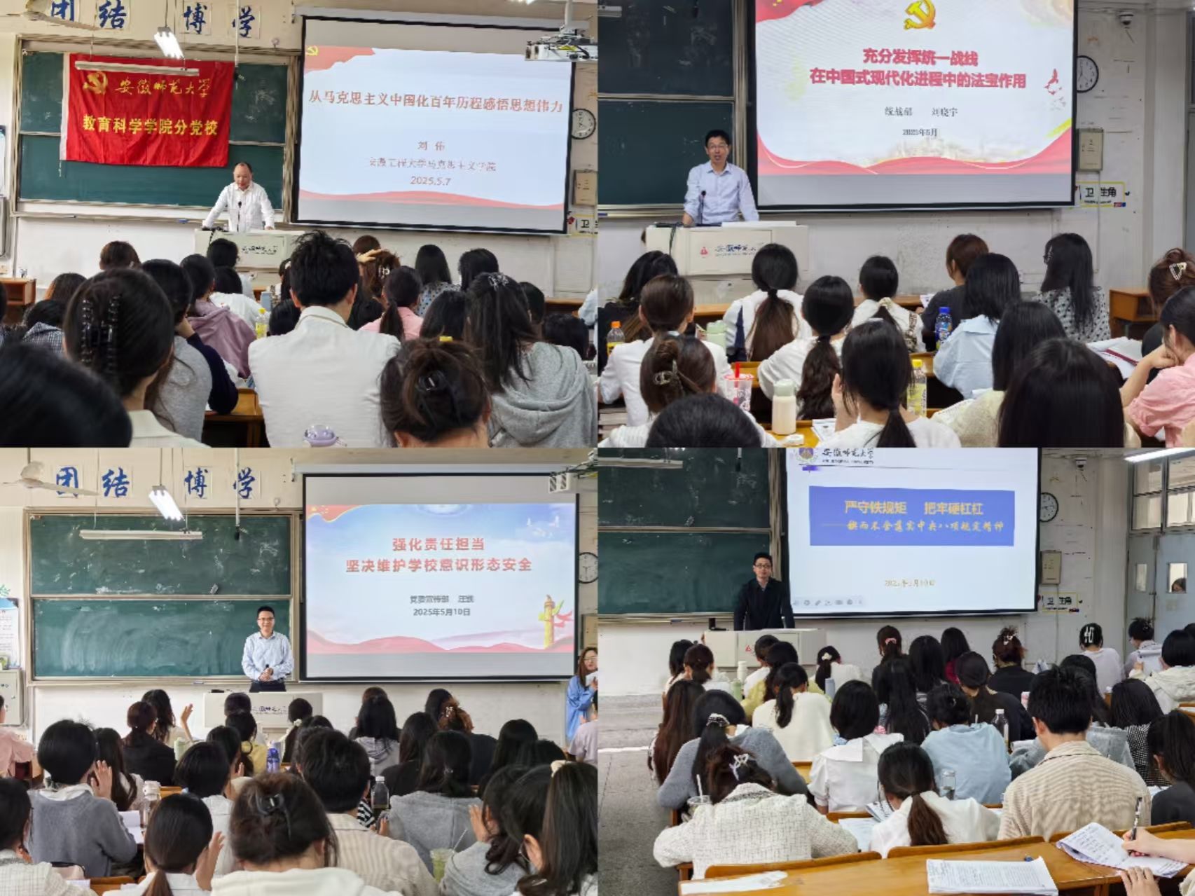 本期党员教育培训班共开展4次理论授课,多位专家老师结合主题为学员们带来精彩丰富的课程。安徽工程大学马克思主义学院党委书记刘伟以“从百年党史中感悟马克思主义中国化的真理伟力”为主题,带领大家深入学习习近平新时代中国特色社会主义思想内涵;校党委统战部常务副部长刘晓宇给大家解读了统一战线在中国式现代化进程中的法宝作用;校党委宣传部常务副部长汪凯带领大家学习《强化责任担当,坚决维护学校意识形态安全》,要求大家筑牢思想防线,在政治上保持坚定、在理论上有清醒认知;纪委办公室案管审理室主任刘长生带领大家深入贯彻中央八项规定精神学习教育,告诫学员们绷紧纪律之弦,做合格党员。理论课程的学习不仅增强学员对党的理论知识的理解,同时也进一步锤炼党性修养。