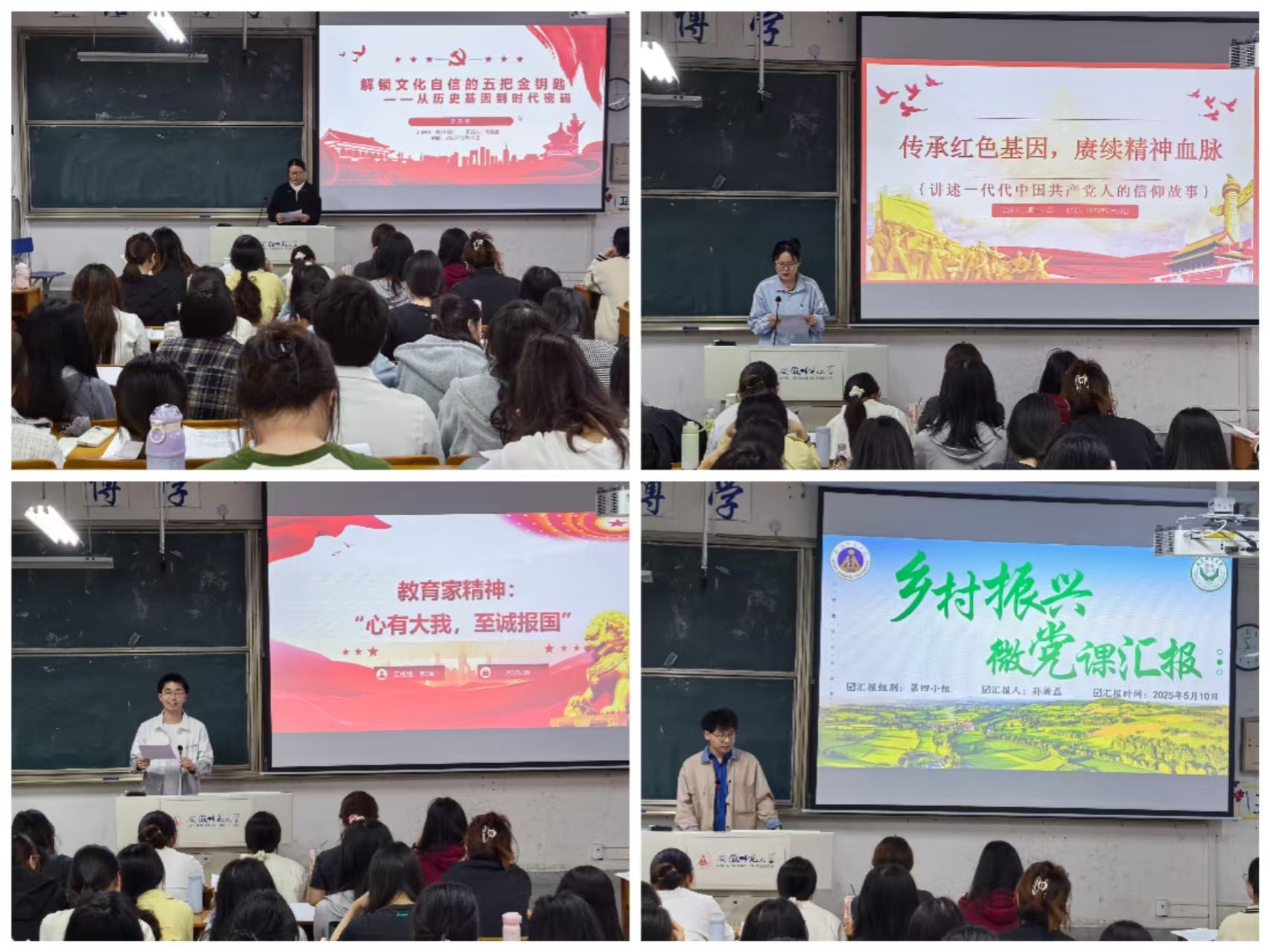 微课录制学习成果,展示思想感悟。培训班开展以小组为单位的微党课录制实践活动,分别开展了以“教育家精神之心有大我、至诚报国的理想信念”解锁文化自信的‘五把金钥匙不忘初心,牢记使命”、乡村振兴”为主题的微党课录制。各小组合理分工协调合作,确保每一位学员的积极参与。录制微党课不仅是阶段性的回顾总结,也是学员们思想上的碰撞。