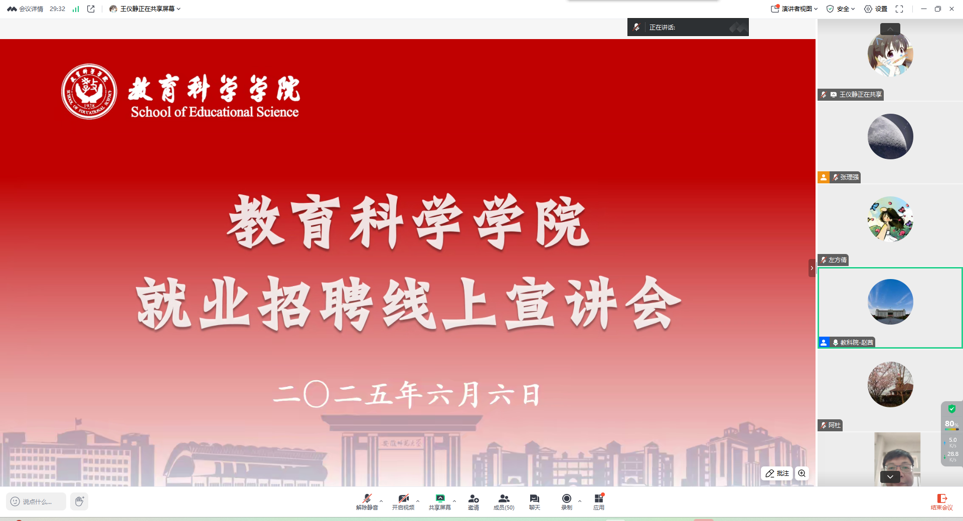 为进一步促进毕业生高质量充分就业,深化校企合作,2025年66日下午,教育科学学院召开就业招聘线上宣讲会。学院党委书记国飞学院党委副书记杜凤2025届毕业班辅导员赵茜张理强10余家用人单位,以及2025届未就业学生代表、2026届学生代表参与此次会议。会议由赵茜主持。