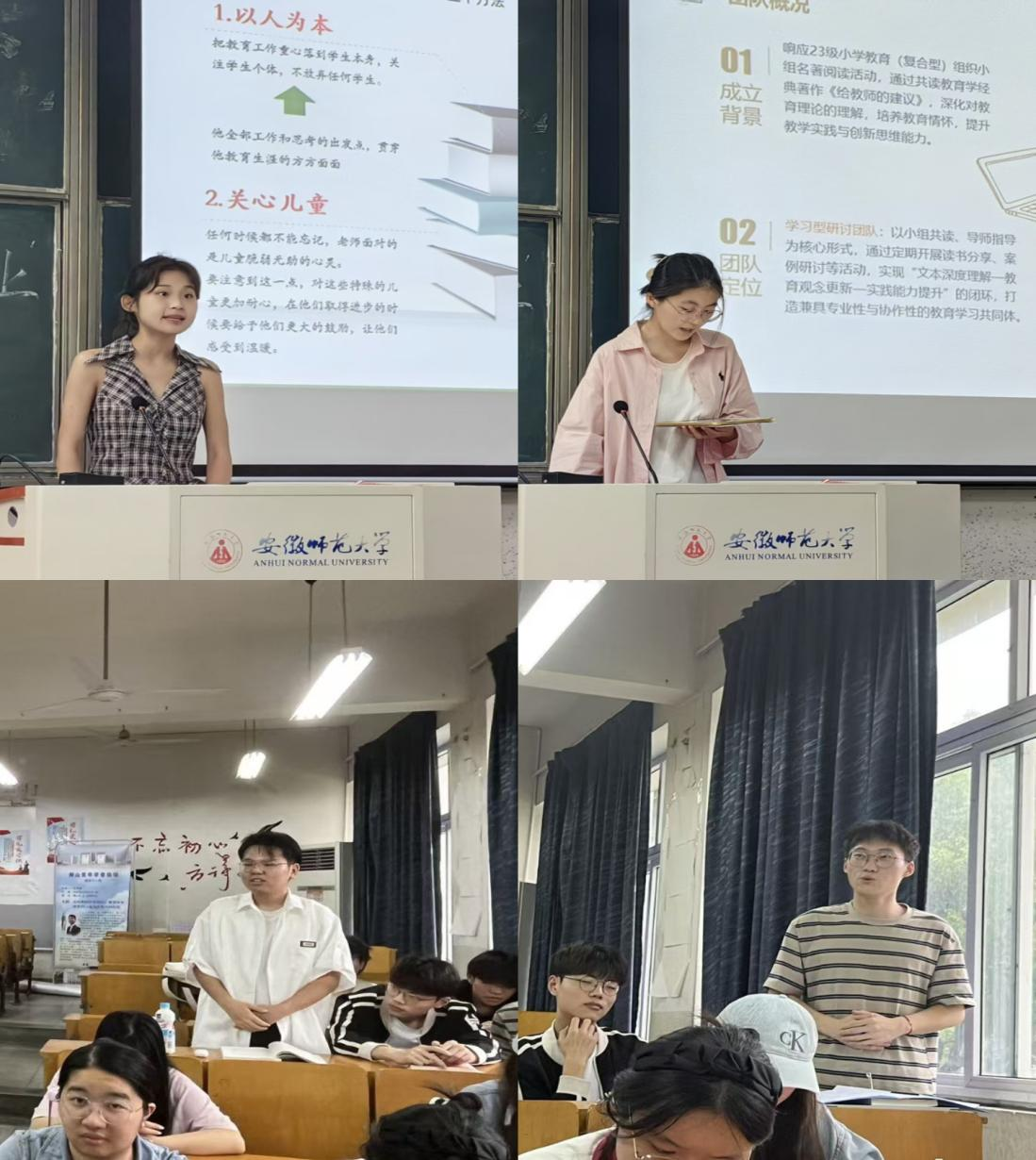 韩建涛强调了研读教育名著对师范生专业培养的基础性、引领性作用。他指出,阅读、思考、写作以及分享、研讨、交流是学生成长的重要环节,并希望研读经典的专业活动能持续进行。随后,六个小组的代表依次进行汇报。