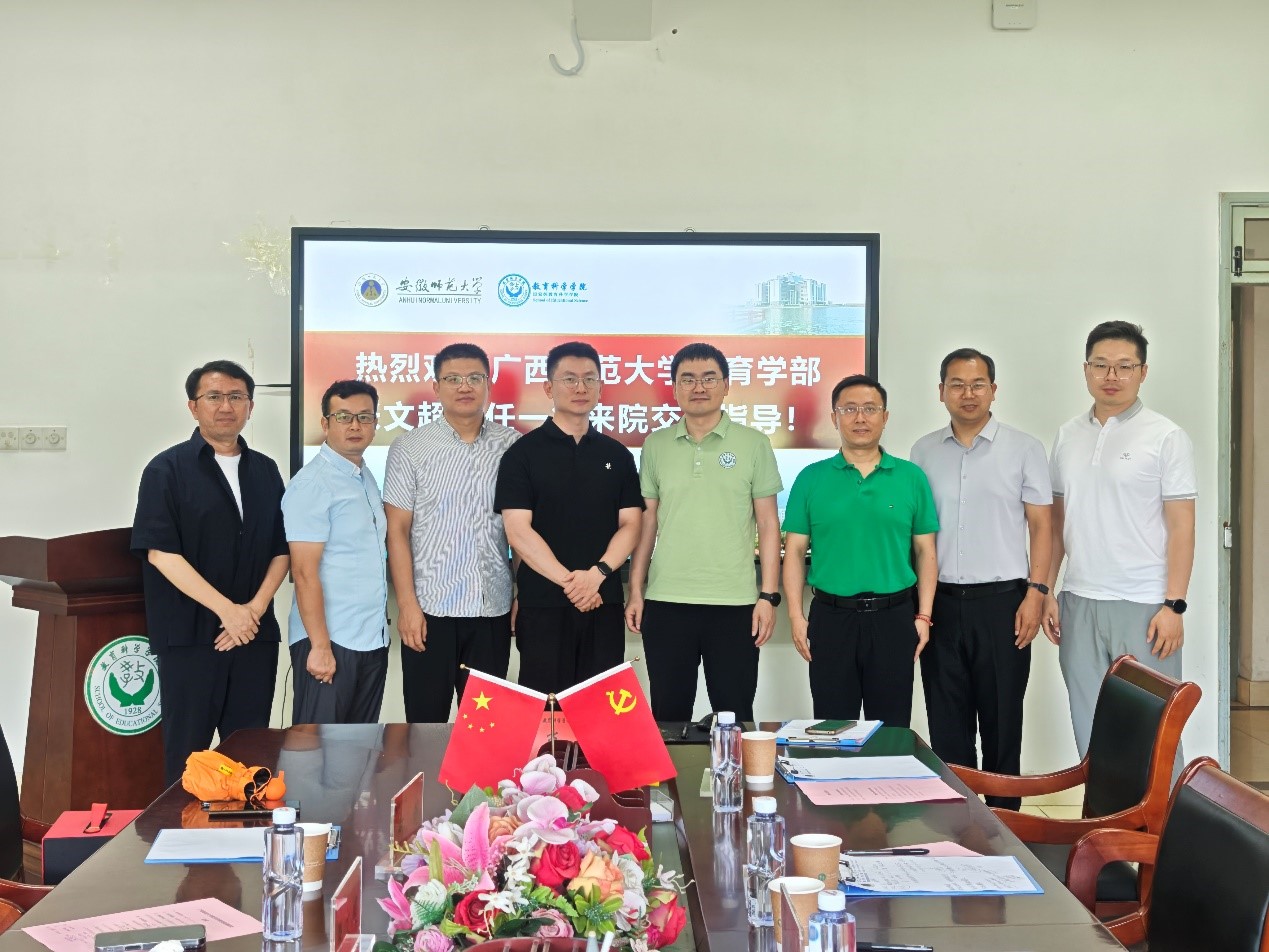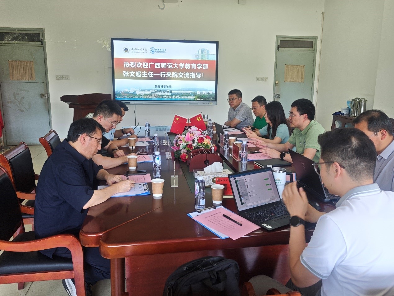2025年6月16日下午,广西师范大学教育学部教育技术系主任张文超、副主任何剑及桂林清风实验学校陈迎春一行莅临我院进行调研交流。我院副院长韩建涛、教育技术学专业负责人肖文、现代教育技术(中美合作)学位点负责人白倩以及教育技术系的杨滨、徐刘杰、周进等教师共同出席了此次交流会议。