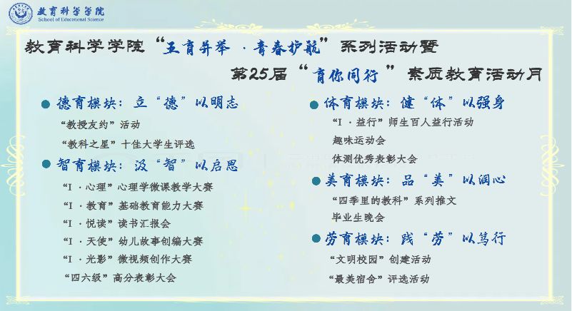 教育科学学院第25届“育你同行”素质教育活动月全面落实素质教育理念,充分发挥学院特色,以丰富多元的形式和充实深刻的内容,为同学们搭建了一个展示自我、提升能力、交流学习的广阔平台,提升了教科学子综合素养。