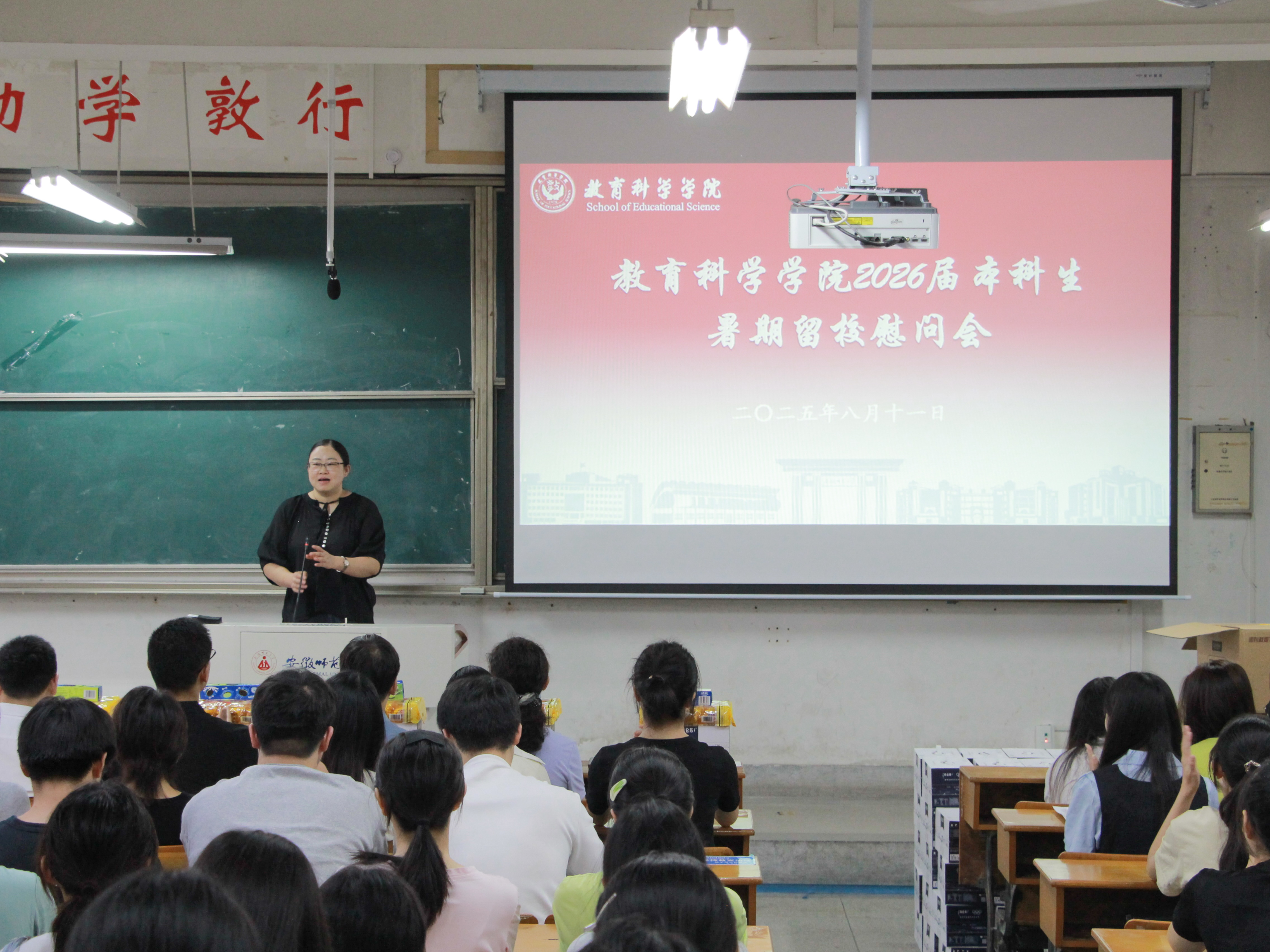 为贯彻落实大学生护航行动计划,增强暑期留校学生的备考信心,8月11日上午,教育科学学院于田楼8102教室召开2026届本科生暑期留校指导慰问会。学院党委书记许国飞、院长吴文涛、党委副书记杜凤、副院长韩建涛、何海燕、2026届毕业班辅导员付银行、程雅楠及全体暑期留校学生参加。会议由付银行主持。