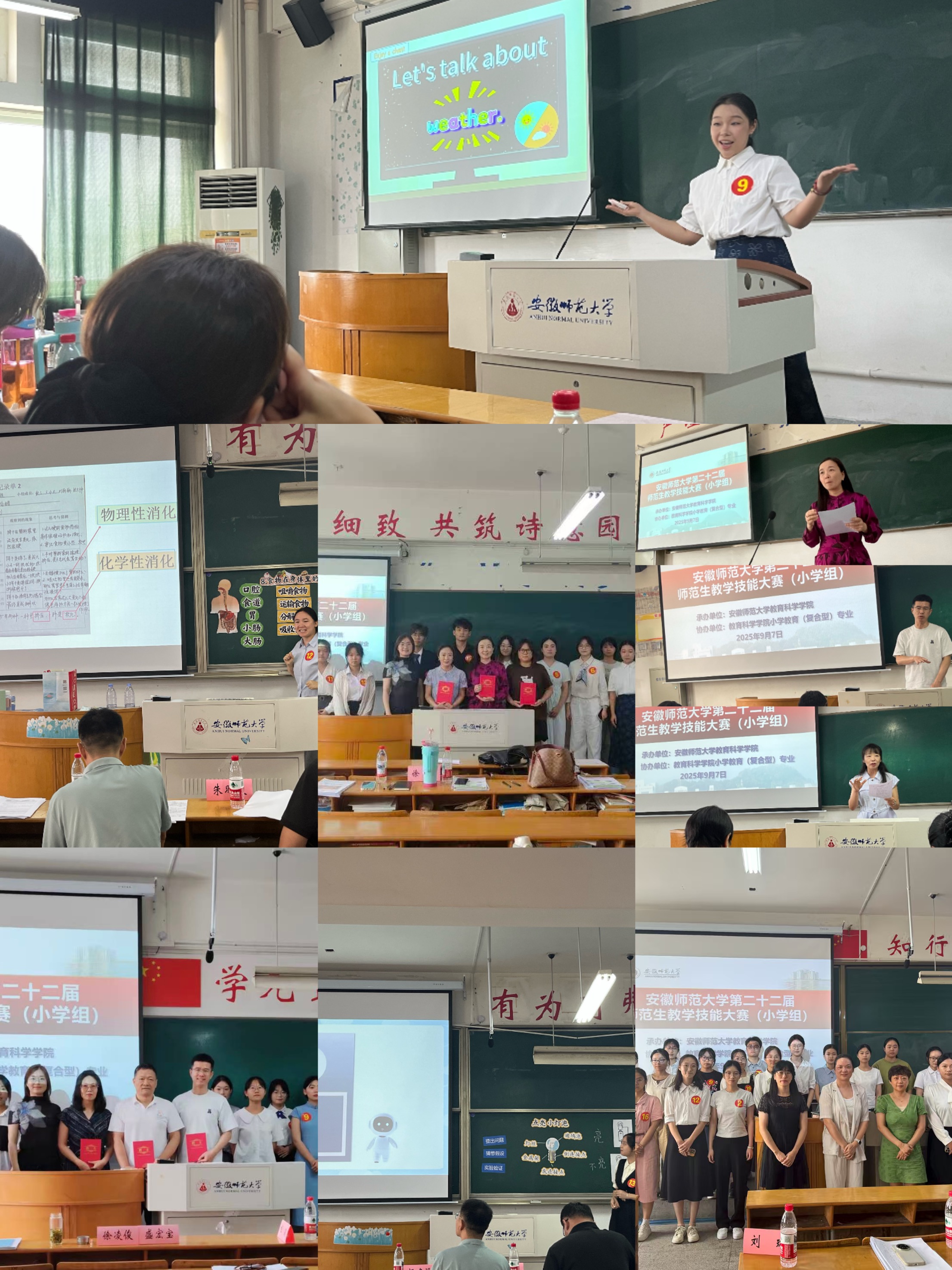 以赛赋能,点亮教育未来主持人宣布结果后,参赛选手与评委们共同合影,定格荣耀时刻。此次师范生教学技能大赛,以“以赛促学、以赛促练”为核心,不仅全面检验了师范生的专业素养,更锤炼了其沟通应变能力与教育情怀。未来,安徽师范大学将持续以这类赛事为抓手,不断提升师范专业人才培养质量,为培育有理想信念、道德情操、扎实学识、仁爱之心的新时代小学教师奠定坚实基础。