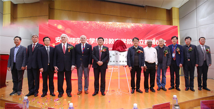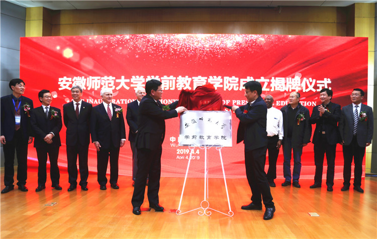 本网讯(文/教科院 孟庆娟  图/党委宣传部 张鑫四月芳菲春意浓,高朋满座幼教兴。44日下午两点,伴随着美丽的幼教天使们欢快的舞蹈和激扬的歌声,安徽师范大学学前教育学院成立揭牌仪式在赭山校区田家炳教育书院三楼报告厅隆重举行。校党委书记顾家山,芜湖市教育局党委书记、局长江汛,安徽商贸职业技术学院院长李忠,校党委常委、宣传部部长胡靖,中国学前教育研究会学前教育基本理论专业委员会主任、华东师范大学博士生导师刘晓东,特邀嘉宾美国布莱诺大学校长Edward Schrader董事会主席Peter Miller、教育学院院长Eugene Williams以及国内外学前教育领域的专家学者,省内兄弟院校教育学院院长、学前教育系主任,省内各地市学前教育教研员代表、幼儿园园长代表,安徽师范大学各职能部门领导、教育科学学院领导和学前教育专业全体师生参加了揭牌仪式。仪式由校党委常委、副校长朱家存主持。