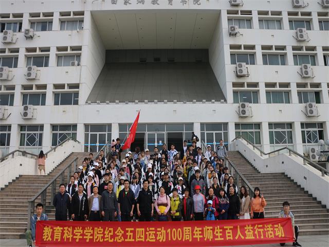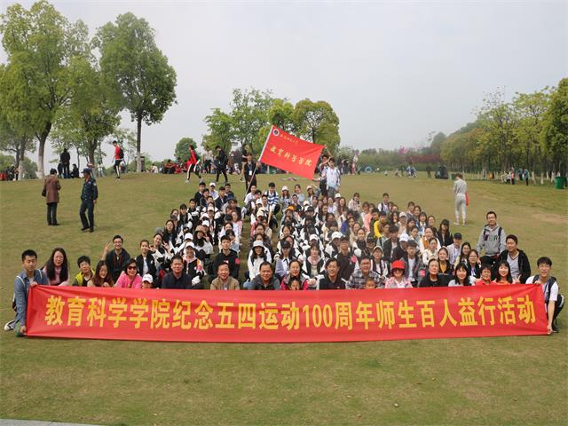 本网讯(教科院 刘晓琴 张亚楠)时值暮春,暖意融融。恰逢五四运动100周年,为更好地继承和弘扬“五四精神”,增强青年学生的素质,丰富我院师生课余生活。教科院于4月13日上午举办了教育科学学院纪念五四运动100周年师生百人益行活动。我院师生积极响应,学院党政领导、部分教职工以及百余名本科生参加了此次活动。