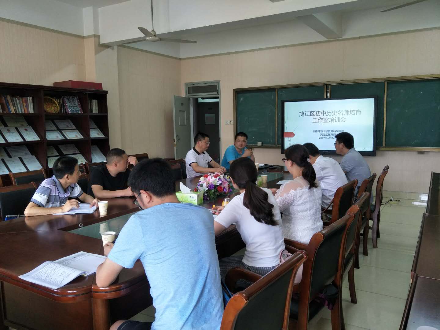 本网讯(李雪、钟婕 供稿)2019年6月27日下午3点,鸠江区初中历史名师培育工作室在教育科学学院408会议室开展了“历史课堂教学艺术设计”专题培训活动。本次活动由我院李卯副教授主持。鸠江区初中历史名师培育工作室的全体研修成员参加了本次培训。