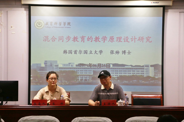 本网讯( 孙志鹏/文 刘媛媛/图)6月25日下午,学院邀请了韩国首尔国立大学教育技术学专业张帅博士以“混合型同步学习的教学设计原理开发研究”为题开展学术报告。报告在我院三楼学术交流中心举行,教育技术系主任张克松副教授担任主持,教育学专业研究生到场学习。