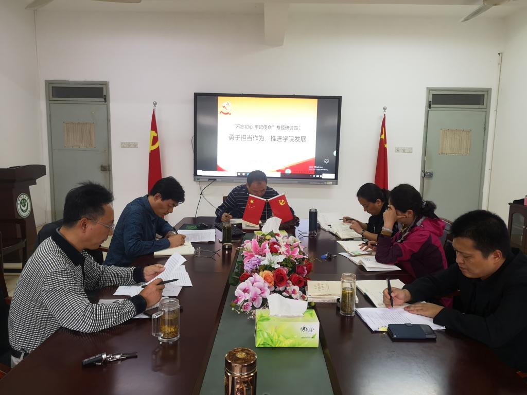本网讯(教科院 袁黎平 朱筱凡)10月12日,按照学校“不忘初心、牢记使命”主题教育的整体部署和学院主题教育的研讨安排,教育科学学院领导班子成员在308会议室围绕“勇于担当作为,推进学院发展”进行第四专题研讨。研讨会由学院党委书记方泓主持,院领导班子成员参加集中学习研讨。