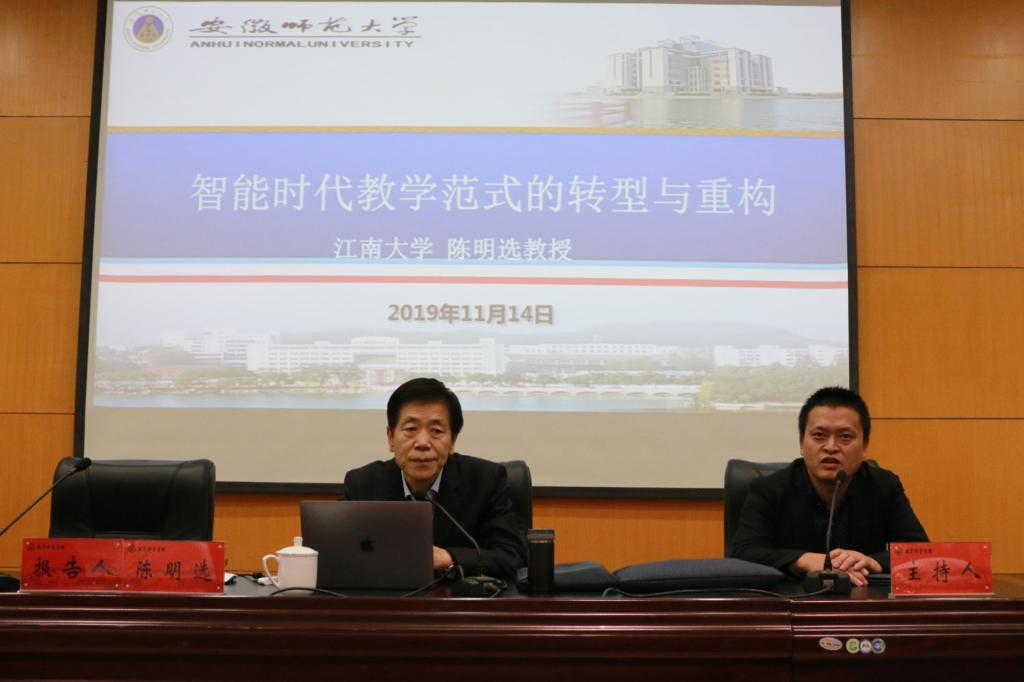 本网讯(教科院 文/夏彩虹 图/姜惠玲)11月14日下午,教育部教育技术教学指导分委员会副主任委员、江南大学教育信息化研究中心主任陈明选教授,应邀在赭山校区田楼报告厅为教育科学学院师生做题为“智能时代教学范式的转型与重构”的学术报告;报告会由教育科学学院副院长聂竹明教授主持,学院相关专业教师、研究生和本科生参加报告会。