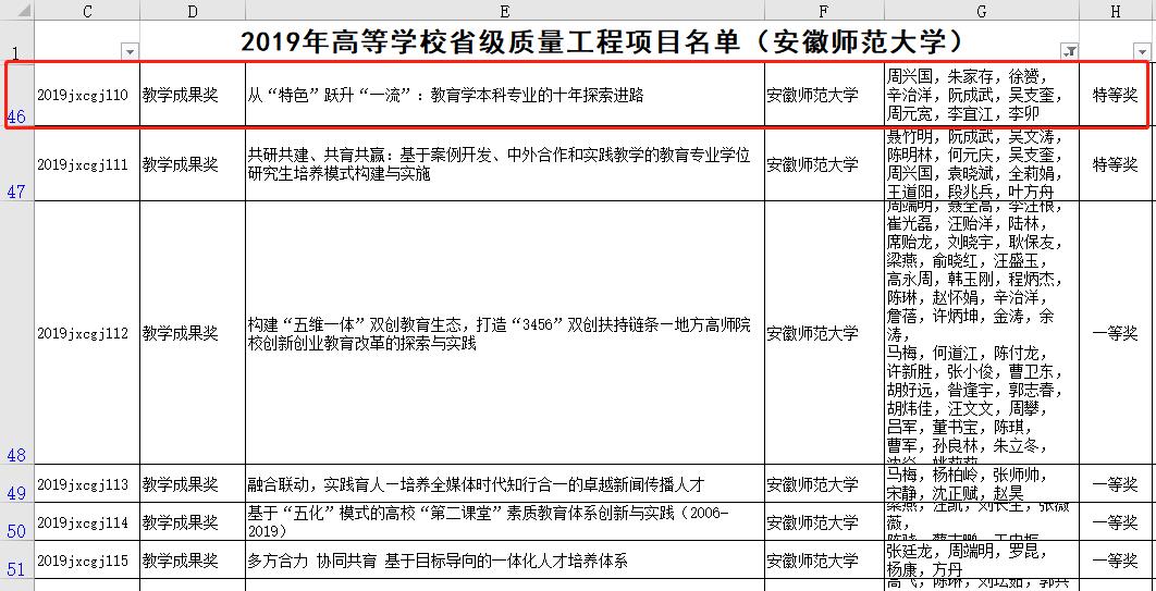 本网讯(教育科学学院) 2019年12月21日,省教育厅正式下发《安徽省教育厅关于公布2019年高等学校省级质量工程立项项目名单的通知》(皖教秘高〔2019〕94号)。由我院周兴国教授领衔申报的教育学专业建设与改革成果《从“特色”跃升“一流”:教育学本科专业的十年探索进路》获安徽省教学成果奖特等奖!该奖项与教育学专业获批国家级一流专业建设点的喜讯一起,共同献礼刚刚召开的校第十一次党代会,也为学院和教育学专业送上新年贺礼!