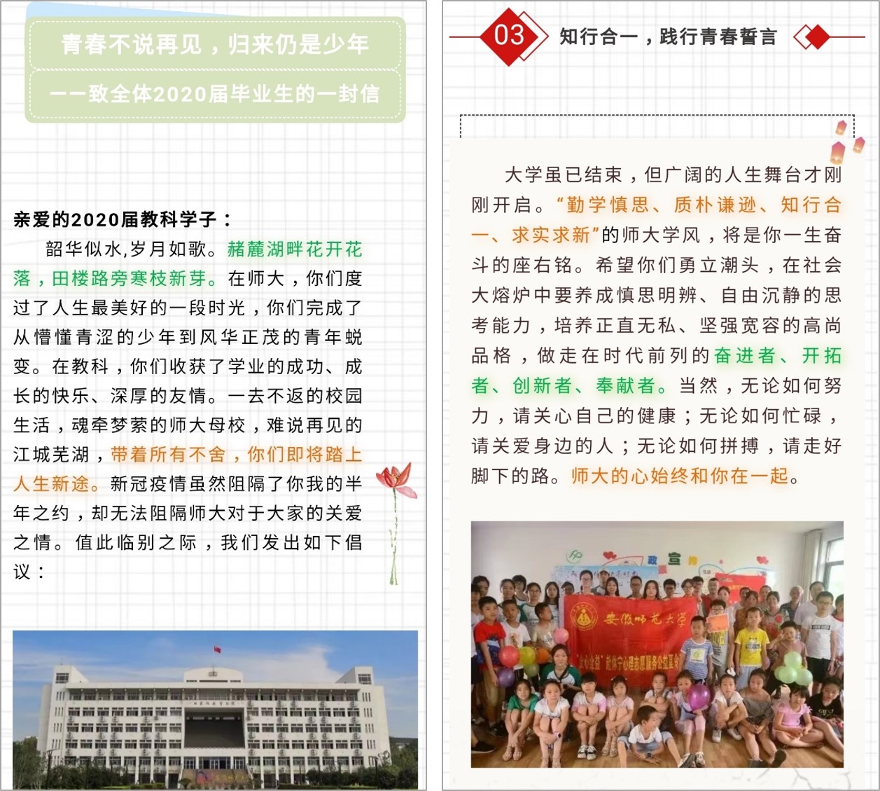 教科院历来高度重视毕业生文明离校工作,本着“教育为先,帮扶为主,重在引导”的宗旨,通过“思想引领、教育引导、真情帮扶、爱心传递、行动感召”五大载体,持续培养学生的爱国主义情怀、提升学生的社会适应能力、注重学生的专业实践能力、强化学生的传统美德观念和抓好学生的成才励志教育,切实教育毕业生坚定理想信念,争做文明先锋;明确青春梦想,科学规划人生;感恩母校恩情,展现骄子风采,在奉献社会、服务人民、报效祖国的历史担当中增强毕业生的责任感和使命感。别宴将至,骊歌渐起,真诚祝愿教育科学学院2020届全体本科毕业生致知力行,继往开来,前程似锦,事业有成!
