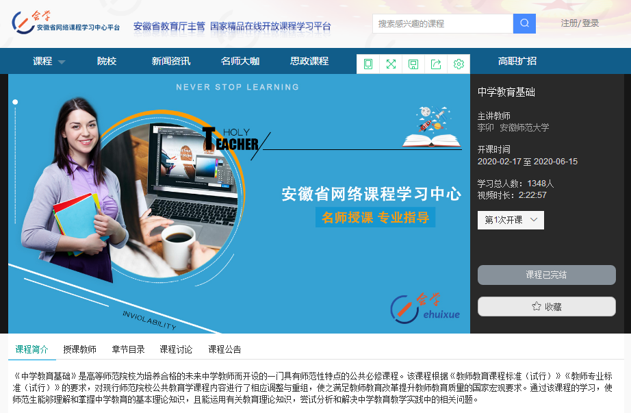 本网讯(教科院)疫情防控期间,为切实保证本科教育在线教学工作质量,教育科学学院公共教育学课程团队充分利用安徽省大规模在线开放课程(MOOC)项目——《中学教育基础》这一网络教学平台开展线上课程建设和教学工作。目前,该项目已经顺利完成第一个完整教学周期的上线运行,并开始第二个教学周期的上线运行。