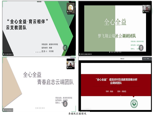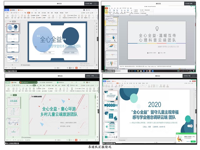 12支团队的负责人结合PPT,从团队分工、实践内容、经费预算及团队特点等方面进行汇报。团队主题各具特色,既有为留守儿童、抗疫一线子女提供课业辅导的支教团队,对不同学段的学生提供启蒙编程等课程的创客送课团队;也有将情怀融入音乐的音乐教学,把趣味带进书本的云端阅读,以直播走出家乡的童心环游等多种创意活动。此外,教科院历来重视留守儿童的心理健康教育,成立“全心全益·心灵护航”留守儿童心理档案构建云调研团队、“全心全益·温暖互传”心理健康教育云端团队以及“全心全益·青春启志”主题宣讲云端团队,充分关注留守儿童心理问题,提供心理辅导援助,激励学生立志明心。