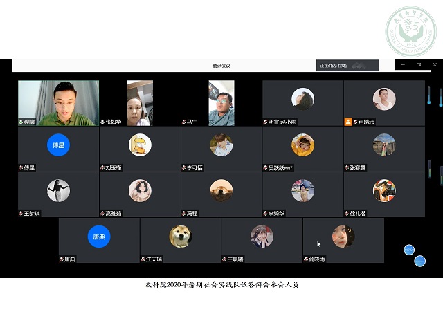本网讯(教科院 赵小雨)为进一步加强暑期社会实践云端团队建设,增强实践活动的可行性、创新性与实效性,选拔优秀实践团队,教科院团委于7月26日晚七点通过腾讯会议开展了教科院2020年暑期社会实践队伍答辩会。教科院党委副书记张如华、院团委书记程啸、和县青年志愿者协会副会长马宁、12支团队答辩人以及部分学生能代表参与了本次会议,此次答辩会由程啸老师主持。