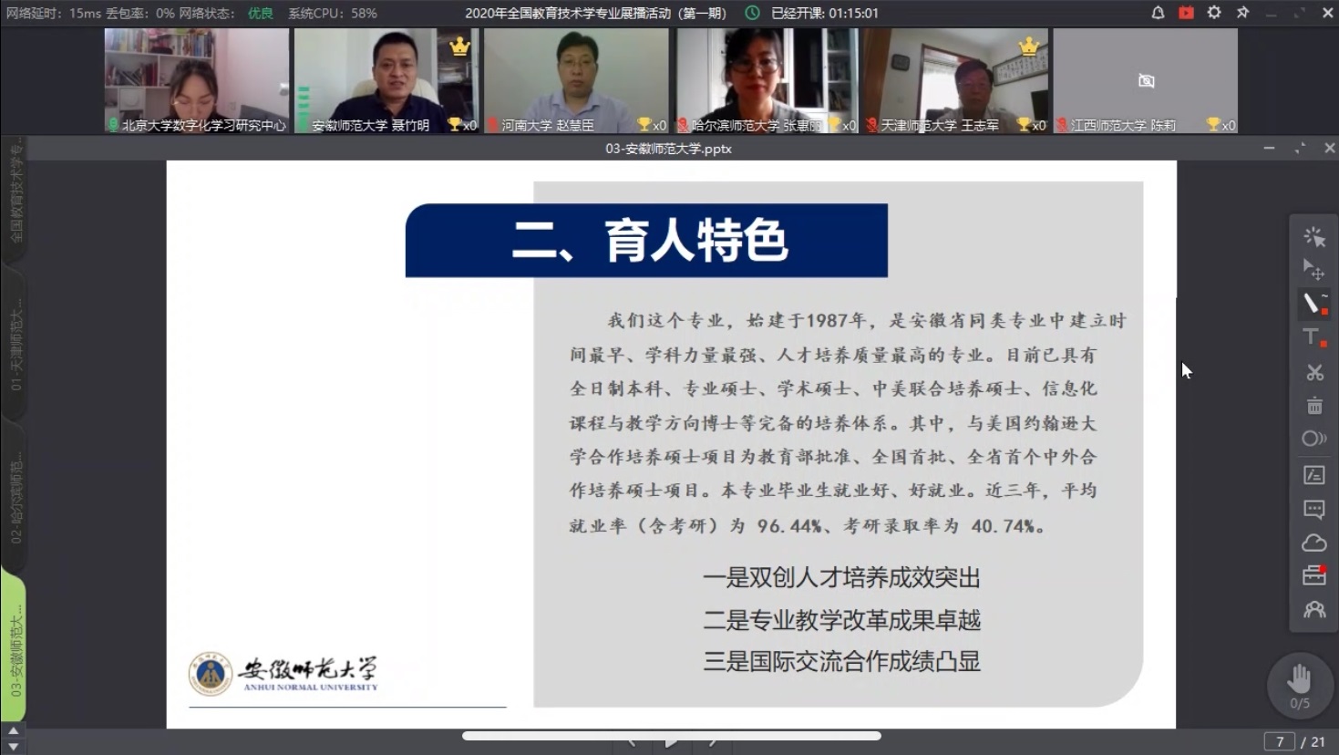 本网讯(教科院 裔艳)8月1日上午,我校与天津师范大学、河南大学、哈尔滨师范大学、江西师范大学等作为第一期主讲嘉宾单位,参加了教育部教育技术教学指导委员会指导、中国电子学会现代教育技术分会主办的全国教育技术学专业展播活动。我院副院长聂竹明教授参加了此次展播活动。
