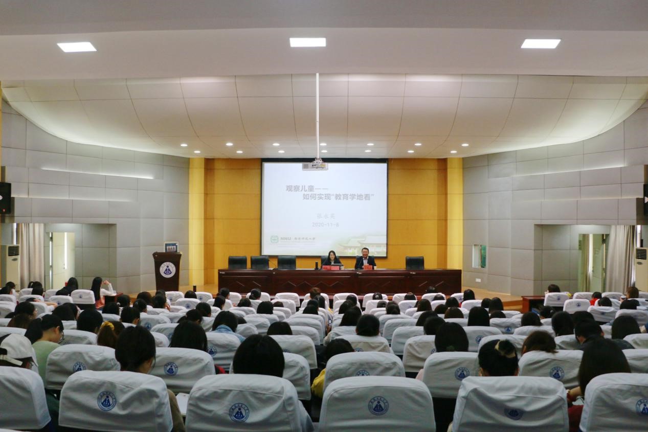 本网讯(教科院 文/张旭航 图/姜惠玲)为丰富我院师生专业性知识储备,提高对学前教育的科学性认知,11月8日下午,南京royal皇家88平台张永英博士应邀做客学前教育学院知行大讲坛,作题为《观察儿童-如何实现“教育学地看”》的学术报告。本次报告在田家炳楼三楼学术报告厅举行,由我院副院长、学前教育学硕士点负责人张更立教授主持,学院教师及学前教育相关专业研究生共计200名左右到场学习,现场秩序井然,报告精彩纷呈。