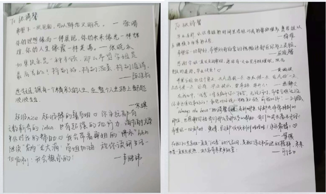 蔡文为支部全体毕业生准备了《浴血荣光》以及《当你像鸟飞往你的山》这两本书作为礼物,2018级的党支部成员为学姐们在扉页写下最真挚的留言祝福。龚伟也表示,与2017级党支部成员一路走来感情很深,感谢大家为样板党支部的验收辛勤付出,希望她们将来常回母校看看。所有的不舍转化为2017级党支部成员们最温暖的动力,给予她们未来的生活更多的信心与鼓励。