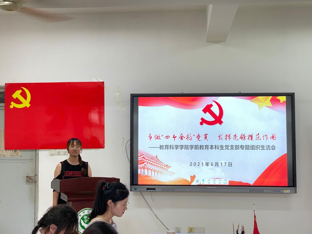 党中央提出“四个合格”党员的理念,即做到政治合格、执行纪律合格、品德合格、发挥作用合格。四位党员同志作为代表,依次分享成为一名党员的心得,并回顾了在支部工作中的收获与进步。张旖馨同学表示:“在支部工作给我感触很深,收获很大,要将每一样任务完成到极致,不辜负党员的身份和责任。”毕业班党员们事事、时时、处处都发挥着他们的先锋模范带头作用,为支部建设贡献自己的力量,带领着支部其他成员共同进步。