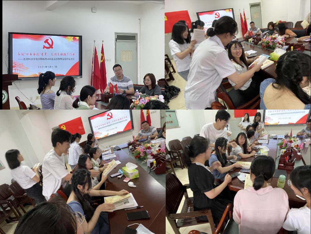 值此中国共产党成立100周年之际,教育科学学院于6月16日下午开展了学生党员交流会,来自不同专业和年级的三位学生代表表达了以党员身份严格要求自己的决心和在未来投身社会、贡献芳华的理想。会上,党委秘书袁黎平带领全体党员面向党旗宣读入党誓词,各位毕业班党员将牢记使命与担当,时刻以党员的觉悟去投身社会、奉献自我。校党委常委、副校长陆林为教育科学学院师生讲授了一场别开生面的思政理论暨党史课,号召大家要做到学史明理、学史增信、学史崇德、学史力行,希望各位毕业班党员能够牢记党员身份,尽好党员义务。