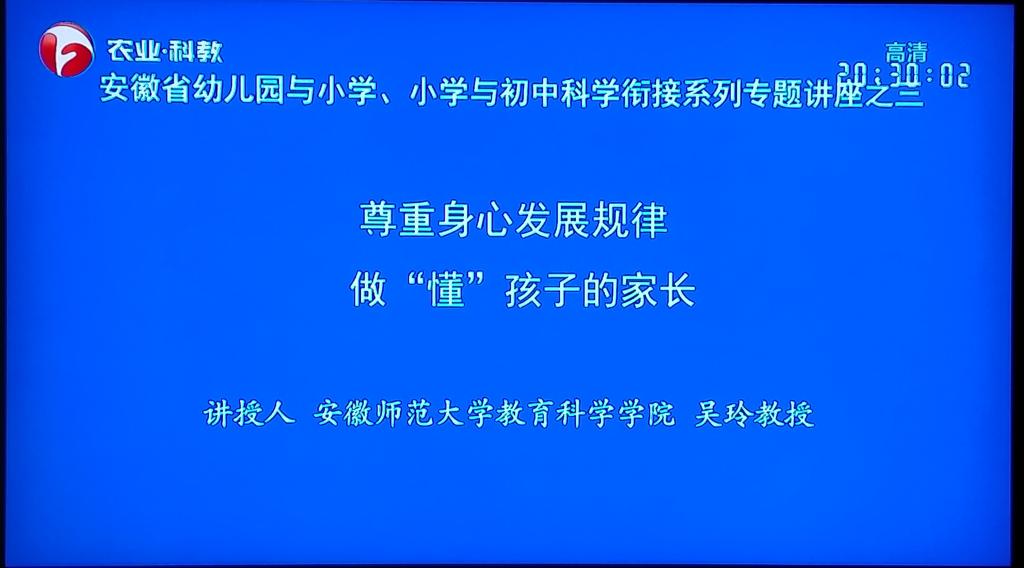 本网讯(教科院)为贯彻落实《教育部关于大力推进幼儿园与小学科学衔接的指导意见》(教基〔2021〕4号),安徽省教育厅专门组织录制了幼小衔接、小初衔接共四期专题讲座视频,并于7月22-25日通过电视频道和网络平台同步播出,全省900多万学生家长受益。我校教育科学学院吴玲教授应邀参加视频录播工作,主讲第三讲《尊重孩子身心发展规律 做“懂”孩子的家长》。