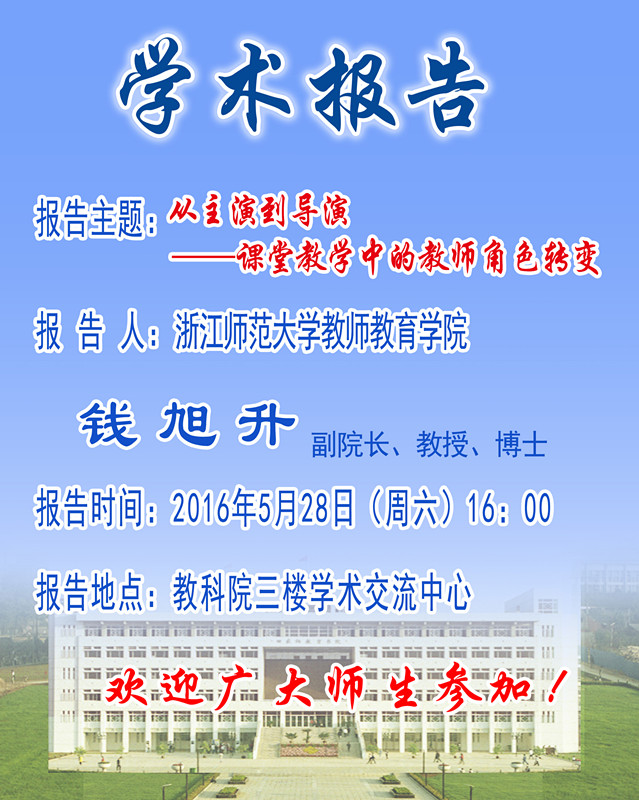 学术报告预告——浙江师范大学教师教育学院副院长、教授、博士钱旭升学术报告