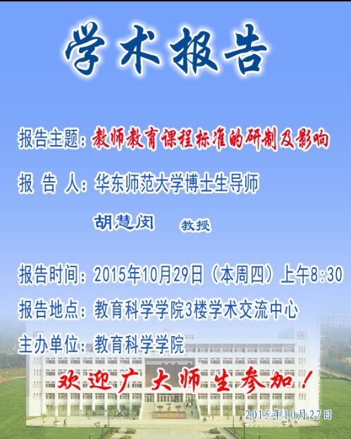 学术报告预告——华东师范大学博士生导师胡慧闵教授讲座预告