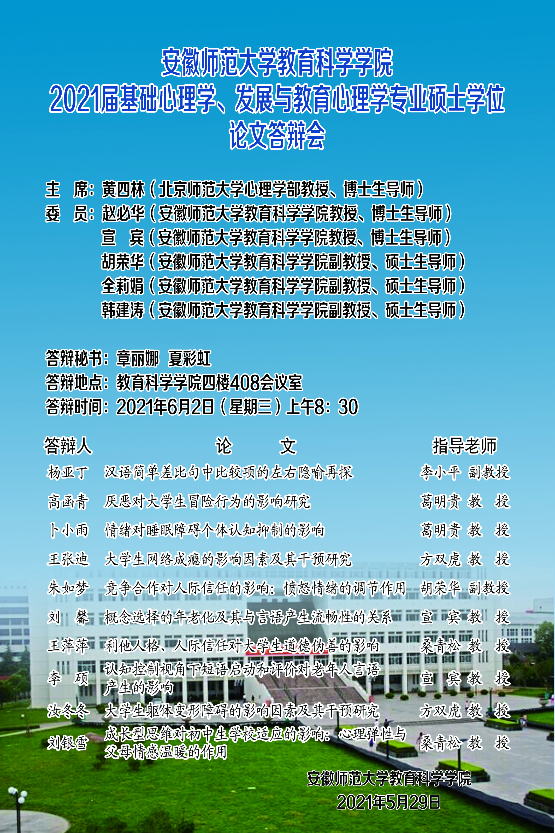 安徽royal皇家88平台2021届基础心理学、发展与教育心理学专业硕士学位论文答辩会