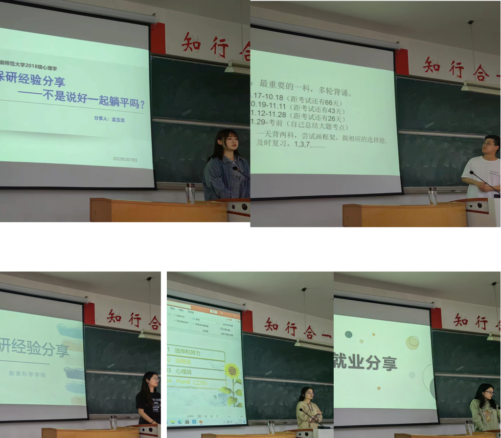2018级保研、考研和就业代表分享各自的经验。孟玉洁分享了保研至北京师范大学的经历,结合各个学校的推免要求使同学们了解了保研流程,在材料准备、专业知识复习等方面为19级的学弟学妹们进行详细梳理。陈相文结合自身一志愿上岸天津师范大学的经验,针对312统考复习,重点讲述了考研的时间安排以及专业课和英语科目的复习建议。李玉倩作为2022届心理学考研最高分的代表,从时间安排、复习规划、资料选择以及心理建设等方面系统且细致地分享经验,建议大家要科学、合理、灵活地规划自己的考研生活,目标明确、学习自律、端正态度、劳逸结合。程敏琪结合自身调剂至陕西师范大学的经验,分享了自己关于考研、调剂、复试等需要注意的事项的认识。易宇君介绍了其求职奇瑞汽车公司的经历,从如何写好一份简历、如何准备面试、如何搜寻招聘信息等方面作出经验分享,帮助同学们拓展就业思路,提醒大家主动关注各方资源,合理定位工作期望,积极提高求职技能,做好充分的求职准备。