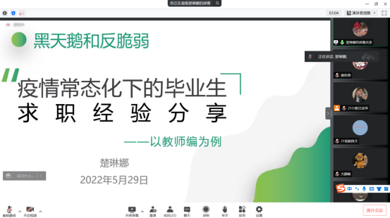 5月29日晚,学院通过腾讯会议平台针对2022届毕业生们开展了小学教育与现代教育技术专场就业指导分享会,研究生辅导员谭茹轩参加了此次会议,近30名硕士研究生在线交流学习,分享会由院研究生会校友部成员汪宜萍主持。